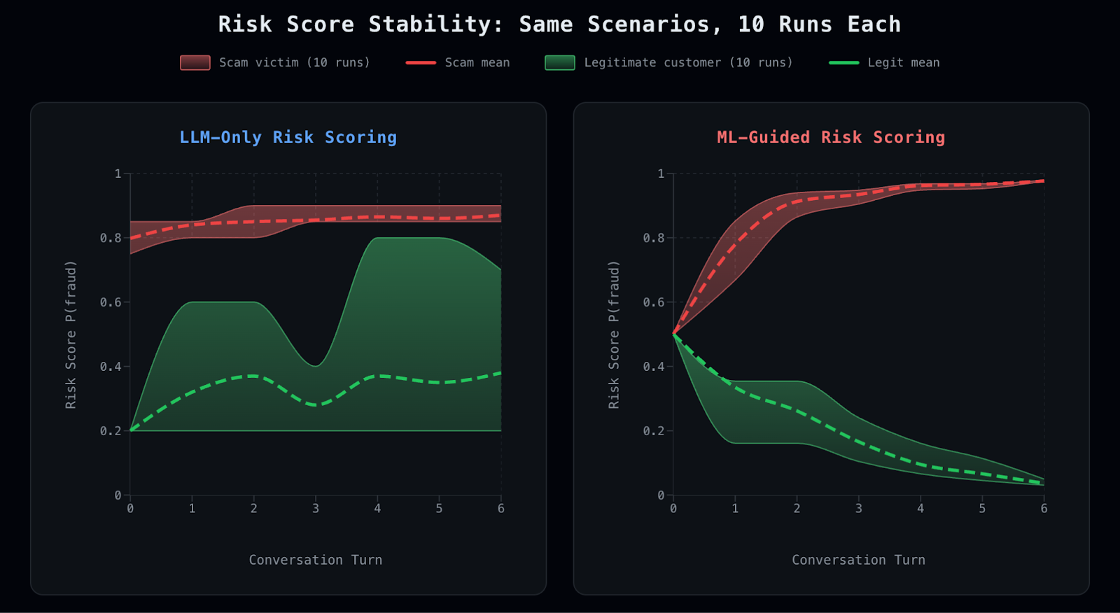 In this experiment, we evaluate two fixed scenarios: a clear scam and a clear legitimate case, repeated 10 times each. The solid lines represent the mean risk score across runs, while the shaded bands show the min–max range. LLM-only scoring produces wide variance across runs, while ML-guided scoring produces tight, stable convergence.