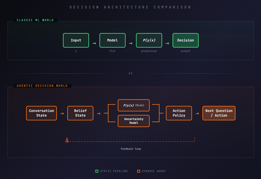 Decision Architecture of Predictive vs Agentic Systems: Classic ML pipelines optimize a single prediction step. Agentic systems continuously update beliefs, combine risk and uncertainty, and select the next action: turning prediction into decision control.